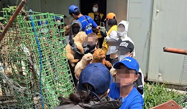 지난 24일 이곳을 찾은 동물보호단체 관계자는 "털에 오물이 엉겨 눈도 뜨지 못하는 개들은 수북한 분변에 구더기가 우글거리는 '뜬장'(공중에 떠 있는 우리) 위에서 불법 사육되고 있었다"고 전했습니다.