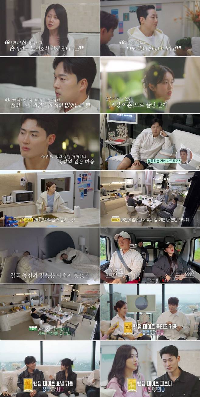 아름은 “순탄한 결혼 생활을 이어가던 중 전 남편에게 신뢰를 잃을 만한 일이 생겼고, 그 생각이 머리에서 떠나질 않아 이혼하게 됐다”라고 얘기했다. 도형은 “결혼 직후 해외로 나가게 돼 단둘이 신혼살림을 시작했는데, 여러 문제로 많이 싸웠다. 그런데 기댈 데가 서로밖에 없다 보니, 그게 함정이 됐다”라며 해외살이에 팬데믹까지 덮쳐 힘들었던 시절을 떠올렸다. 명은은 “결혼 후 어떤 일이 생기면서 그로 인해 매일 같이 싸웠다. (전 남편과) 관계 유지를 위해 할 수 있는 걸 다 해봤지만, 건강이 급격히 안 좋아져서 양가 부모님께 말씀드리고 이혼을 결정했다”라고 눈물을 글썽였다. 인형은 “결혼할 때 양가 경제 규모가 좀 차이가 났다. 저희 부모님께서 여러모로 지원을 많이 해주셨다. 그러던 중, 직장 때문에 주말 부부가 됐는데, 어느 날 평소보다 빨리 집에 가니까 아내가 반기질 않고 짜증을 내는 거다. 거기에 남자 인기척까지 느껴졌다”라고 아내의 외도 현장을 목격했다고 털어놨다. 동건 역시 “전 아내가 유부녀 란 사실을 숨긴 채 다른 남자들과 연락하고 지내는 걸 알게 돼 신뢰를 잃었다”라며 결혼식도 올리기 전 이혼해야 했던 사연을 전했다.