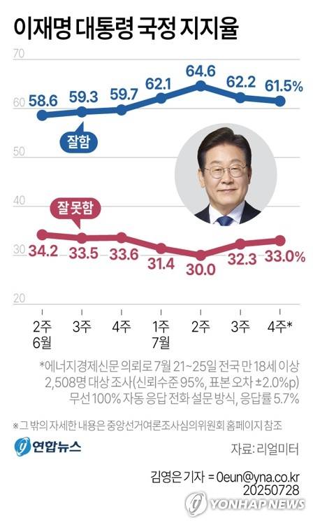 (서울=연합뉴스) 곽민서 기자 = 이재명 대통령의 국정 수행을 긍정적으로 평가한 지지율이 61.5%를 기록했다는 여론조사 결과가 28일 나왔다.