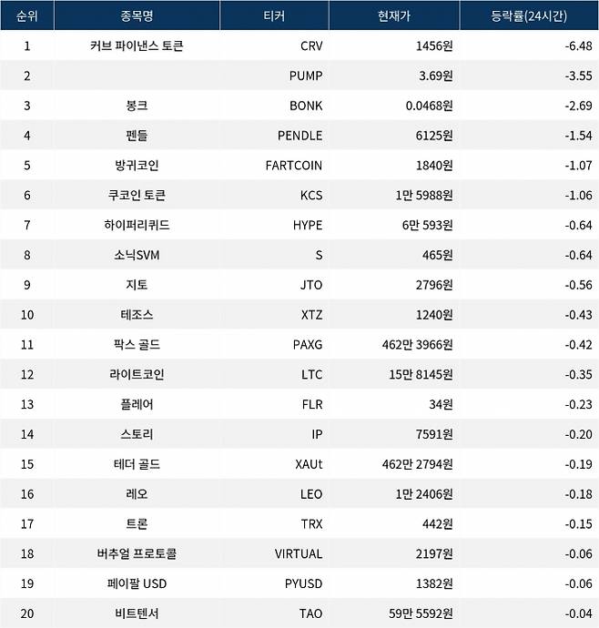 [서울데이터랩]커브 파이낸스·펌프·봉크, 24시간 하락률 상위