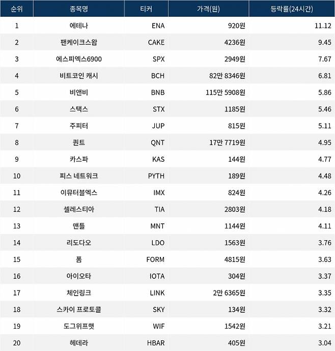 [서울데이터랩]에테나·팬케이크스왑·에스피엑스6900 24시간 상승률 상위