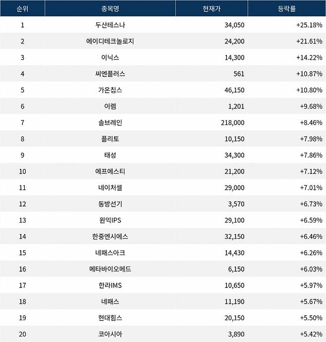 [서울데이터랩]‘두산테스나’ 25.18% 폭등…실시간 상승률 1위