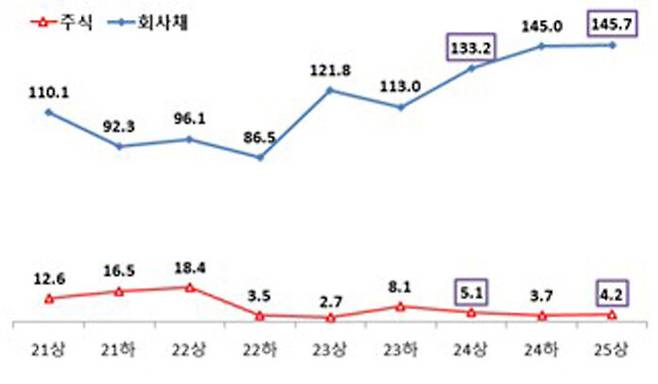 금융감독원은 오늘(28일) 발표한 '25년 상반기 기업의 직접금융 조달실적'에서 상반기 회사채 발행이 145조 6천986억 원으로 지난해 동기 대비 9.3% 증가해 역대 최대 규모를 기록했다고 밝혔습니다.