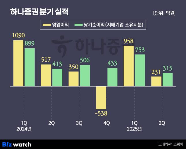 2분기만 따져보면 실적 하락폭이 더 컸다. 하나증권의 2분기 영업이익은 230억5900만원으로 작년 2분기보다 55.4% 급감했다. 지배주주 순이익도 23.7% 줄어든 314억6300만원에 머물렀다.