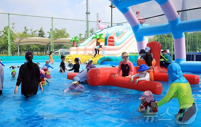 (서울=뉴스1) 김진환 기자 = 28일 오전 서울 강남구 일원에코파크 내 족구장에 마련된 물놀이장에서 어린이들이 물장구를 치며 무더위를 식히고 있다. 2025.7.28/뉴스1