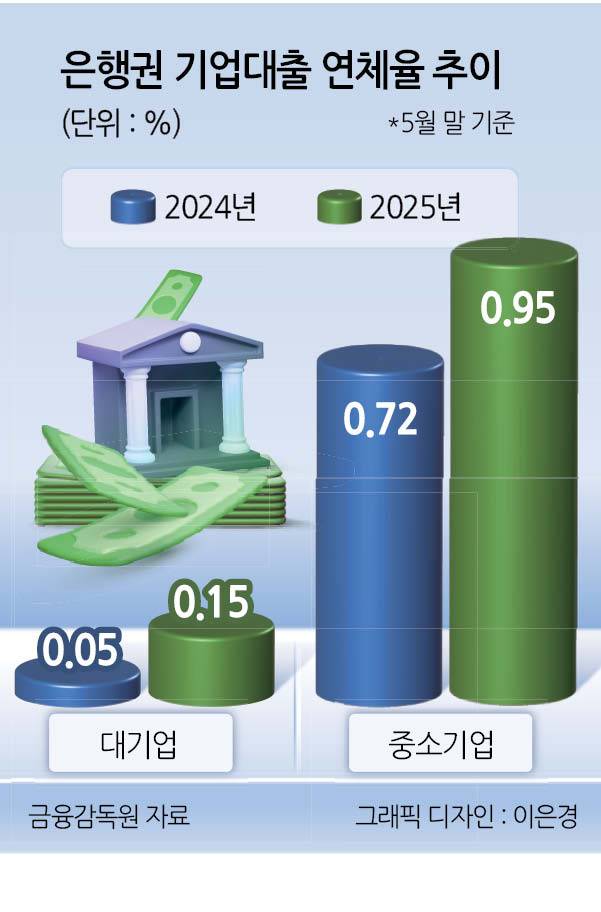 실제 금융감독원에 따르면 지난 5월 말 기준 기업대출 연체율은 0.77%로 지난해 5월(0.58%)보다 0.19%포인트 올랐다. 전월(0.68%)과 비교해도 0.09%포인트 상승했다. 특히, 중소기업대출 연체율은 0.95%로 대기업대출 연체율(0.15%)보다 6배 넘게 높았다. 중소기업대출 중에서도 중소법인 연체율이 1.03%로 개인사업자대출 연체율(0.82%)보다 높았다.
