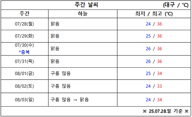 7월 5주 차 아침 기온 24도에서 26도, 낮 기온은 33도에서 36도 예상됩니다.