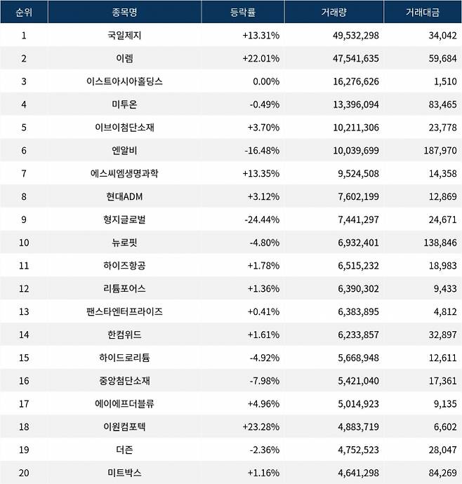 한편 거래량 상위 20위권 종목들은 하이즈항공(221840)(221860) ▲1.78%, 리튬포어스(073570)(900270) ▲1.36%, 팬스타엔터프라이즈(054300)(054300) ▲0.41%, 한컴위드(054920)(054920) ▲1.61%, 하이드로리튬(101670)(101670) ▼4.92%, 중앙첨단소재(051980)(054930) ▼7.98%, 에이에프더블류(312610)(312610) ▲4.96%, 이원컴포텍(088290)(114810) ▲23.28%, 더즌(462860)(134580) ▼2.36%, 미트박스(475460)(238090) ▲1.16% 등의 성적을 기록했다.