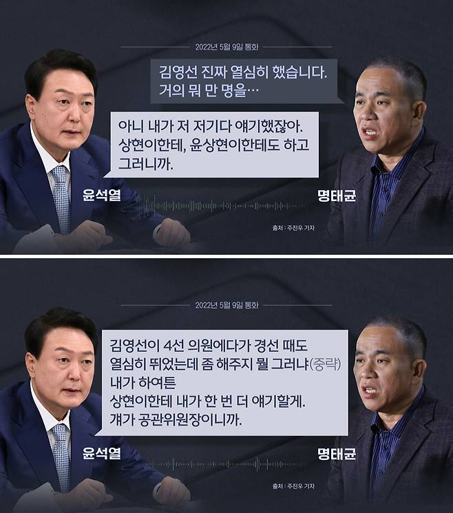 2022년 5월 9일, 윤 전 대통령이 명 씨에게 전화통화로 김영선 전 의원 공천을 언급하며 "상현이한테 내가 한 번 더 이야기할게, 걔가 공관위원장이니까"라고 말하는 녹취가 공개되기도 했습니다.