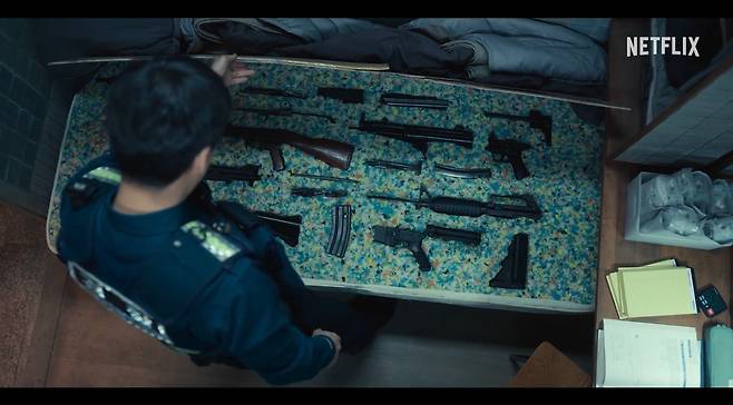 '총기 재난 액션'을 내세운 넷플릭스 <트리거>는 이 총기 청정국 신화를 깨뜨리려는 의도를 숨기지 않는다. 앞서 소개한 '만약에 한국에 총이 풀리면 어떻게 될까'라는 직설적인 대사를 보라. 숨기지 않는 정도가 아니라 그런 의도를 품은 채로 장르적 욕망을 아예 대놓고 드러내고 전시한다. <트리거>는 한국에 총기가 무분별하게 풀리는 드라마 속 극적 상황을 어떻게 가능하게 만들었는가.