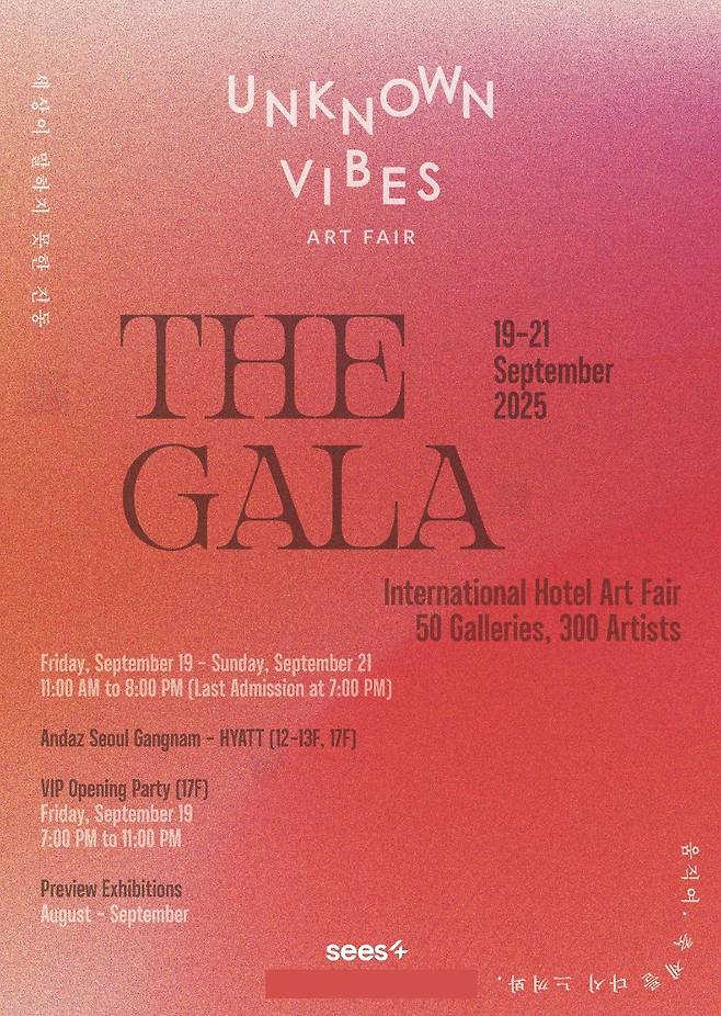 예술을 경험하고 소유하며 공유하는 새로운 문화 인프라를 구축하는 아트페어 기획사 시즈포(SEES4)가 오는 2025년 9월 19일(금)부터 21일(일)까지 서울 안다즈 호텔에서 프리미엄 호텔 아트페어 《언노운바이브-더갈라 (UNKNOWN VIBES – The GALA)》를 개최한다.