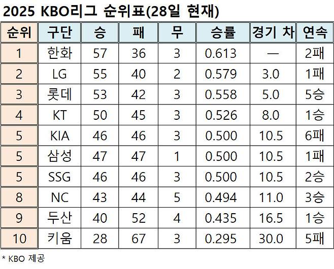 6연패에 빠진 기아(KIA) 타이거즈는 가을야구 마지노선인 5위 싸움으로 떨어졌고, 엘지(LG) 트윈스와 롯데 자이언츠는 연승 가도를 달리며 선두 한화 이글스를 맹추격했다.