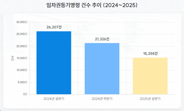 28일 대법원 등기정보광장에 따르면 올해 상반기(1∼6월) 전국 아파트와 빌라 등 집합건물 임차권등기명령 건수는 총 1만5255건으로 지난해 상반기(2만6207건) 대비 41.4% 감소했다.