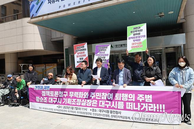 이들 단체는 황 대변인이 지난 2023년 4월 홍준표 시장이 시민의 시정참여를 제한하기 위해 추진한 '시민정책토론청구조례'의 개악을 주도했을 뿐 아니라 같은해 11월 열린 대구시의회 행정사무감사에서 거짓 증언으로 시민과 시의회를 기만했다고 주장했다.