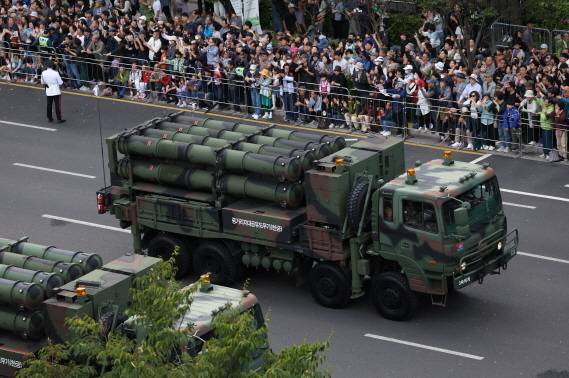 [건군 제76주년 국군의 날 시가행진이 열린 1일 서울 중구 세종대로에서 중거리지대공유도무기 천궁이 광화문 방향으로 행진하고 있다. (사진=연합뉴스)]