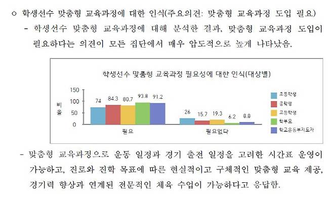 특히 학생선수 맞춤형 교육과정에 대해선 응답자 대다수가 도입 필요성에 공감했다. 초등학생 74.0%, 중학생 84.3%, 고등학생 80.7%, 학부모 93.8%, 지도자 91.2%가 '필요하다'고 응답했다. 응답자들은 운동 일정과 경기 출전 일정을 고려한 탄력적 시간표 운영, 진로 진학 목표에 따른 구체적 맞춤형 교육, 경기력 향상과 관련된 전문적 체육수업이 필요하다는 점을 강조했다.