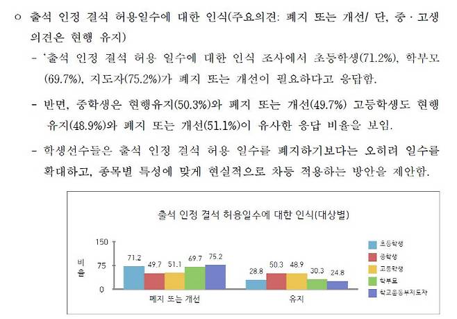 출석인정 결석 허용일수에 대해선 흥미로운 결과가 나왔다. 2023년 문화체육관광부와 교육부가 학생선수의 대회 및 훈련 참가를 위한 '출석인정 결석 허용일수'를 초등학교 5일에서 20일, 중학교 12일에서 35일, 고등학교 25일에서 50일로 확대한 후 현장에서 정책이 정착 단계에 접어든 것으로 보인다. 초등학생(71.2%), 학부모(69.7%), 지도자 집단(75.2%)은 개선 필요성이 있다는 응답 비율이 높았고, 중·고등학생의 경우 현행 유지(50.3%-48.9%)와 개선 필요성(49.7%-51.1%)에 대한 의견이 반반으로 나타났다. 출석인정 허용일수를 폐지하기보다는 종목 특성 및 대회 일정 등을 고려해 결석 허용 일수를 유연하게 차등적용하는 방안도 제시됐다.