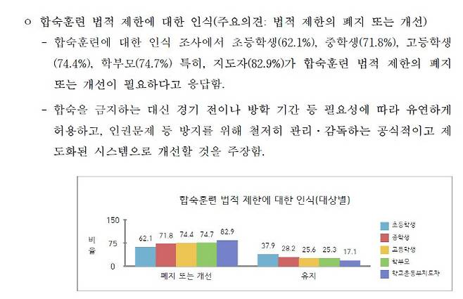 합숙훈련의 법적 제한에 대해서도 '폐지 또는 개선이 필요하다'는 의견이 많았다. 초등학생 62.1%, 중학생 71.8%, 고등학생 74.4%, 학부모 74.7%, 지도자 82.9%가 현행 규제를 조정해야 한다는 입장을 밝혔다. 일부 응답자는 합숙을 전면 금지하기보다는 경기 직전이나 방학 등에 한해 유연하게 허용하고, 인권 보호와 안전 관리를 위한 체계적 관리, 감독 시스템을 도입하는 방향으로 개선할 필요가 있다고 주장했다.