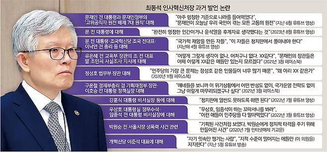 최 처장은 민주당 정권 인사들에 대해서도 전현직을 막론하고 거친 언사를 보였다. 특히 문재인 전 대통령을 여러 차례 저격했다. 최 처장은 지난달 유튜브 영상에서 “문재인이 오늘날 우리 국민이 겪는 모든 고통의 원천”이라고 말하며 문재인정부의 ‘고위공직자 원천 배제 7대 원칙’에 대해 “아주 멍청한 기준으로 나라를 들어먹었다”고 말했다. 지난해 4월 영상에서는 문 전 대통령과 조국혁신당 조국 전 대표 등을 겨냥해 “국가적 재앙을 만든 자들”, “이 자들은 정치판에서 몰아내야 한다”고 말했고, 2023년 8월 영상에서는 문 전 대통령을 두고 “완전히 멍청한 인간이거나 윤석열을 후계자로 생각했다는 것”이라고 했다. 2021년 사회관계망서비스(SNS)에 올린 글에선 문재인정부의 유은혜 전 교육부 장관을 향해 “어떻게 그렇게 생각이 없나. 어처구니없다. XX 같다”, “문재인의 장관들은 어째 이렇게 XX 같은 애들만 있는지 모르겠다”고 하기도 했다.