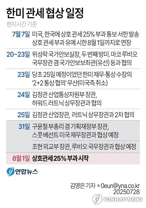 미국이 예고한 상호관세 부과일인 8월 1일을 불과 나흘 앞두고 협상 시한이 촉박한 가운데 최종 협상 타결을 위해 총력전을 벌이는 것으로 해석된다.