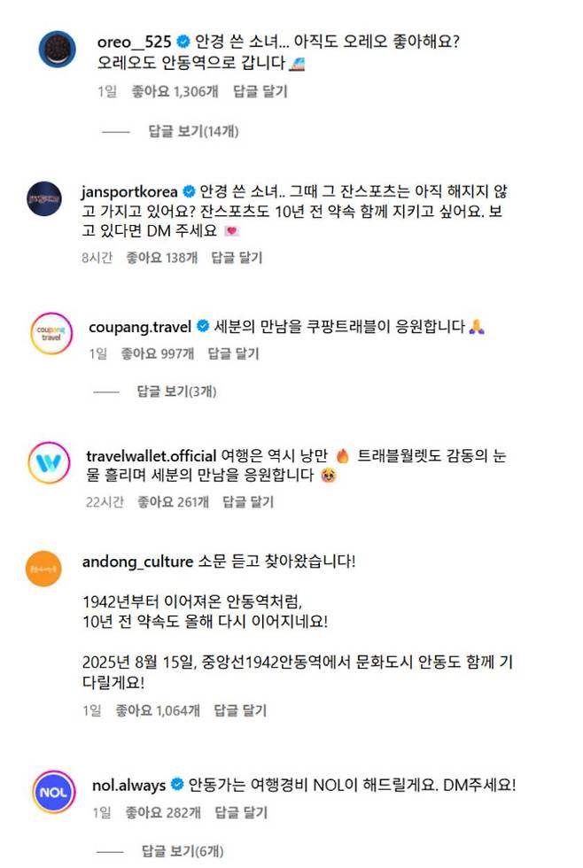 코레일유통, 알바몬, 오레오, 쿠팡, 잔스포츠코리아, NOL(구 야놀자) 등 각종 기업들도 댓글을 달며 등판해 관심을 표하고 있다.
