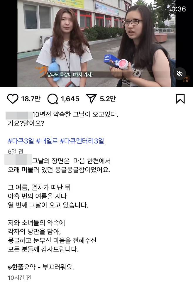 약속을 기억하고 있던 여학생은 3년 전, 유튜브 채널을 통해 "아침부터 역에서 홀로 촬영하고 계시던 피디님! 어디서 어떤 일을 하고 계시나요? 지금도 카메라와 일을 하고 계시나요? 가끔 이때가 생각나요. 25년 8월 15일. 3년 남짓 남았네요. 15년 대학생이던 저는 지금 대학원생이 되었네요. 진공포장된 21살이 여기 있네요. 친구들도 봤다고 연락을 줬는데. 3년 후 피디님 안동역에서 뵈어요. 그때는 코로나가 없는 건강한 세상이기를!!"이라는 글을 남기기도 했다.