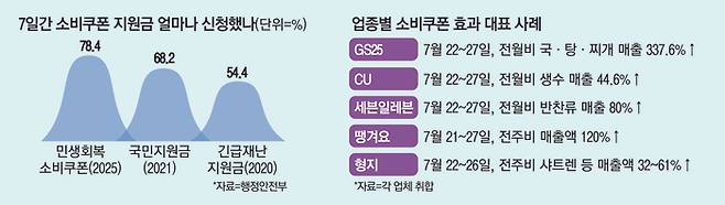 28일 행정안전부에 따르면 이번 민생회복 소비쿠폰 1차 지급은 기존 지원금 지급보다 더 빠른 속도로 신청이 몰리고 있다. 소비쿠폰 신청 일주일(27일 자정 기준) 만에 지급 대상자의 78.4%인 3967만3421명이 신청을 마쳤다. 2020년 긴급재난지원금, 2021년 국민지원금의 같은 기간 신청과 비교해 신청 비율이 각각 24.0%포인트, 10.2%포인트 증가했다. 이 기간 지급된 금액은 7조1200억원에 달한다.