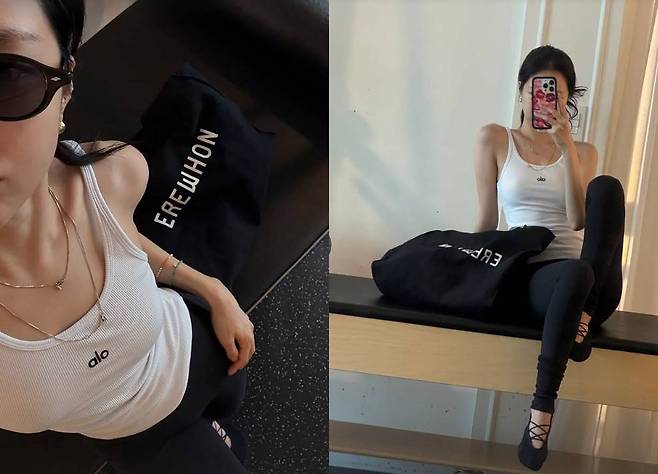 거울 셀카와 상반신 클로즈업 사진을 공개했는데, 흰색 슬림핏 슬리브리스와 블랙 레깅스를 매치해 눈길을 끌었다. 편안한 운동복 차림임에도 불구하고 우아한 분위기와 군살 없는 라인으로 감탄을 자아냈다.