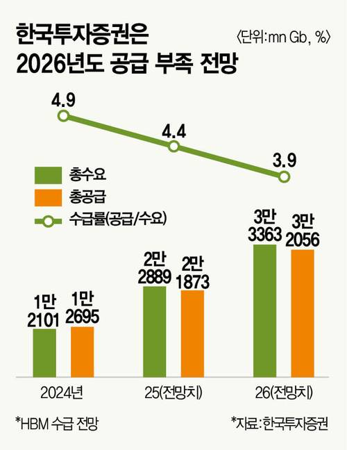 비슷한 이유로 2026년 HBM 공급 부족을 점치는 시각도 있다. 뱅크오브아메리카(BofA)는 최근 보고서에서 신규 GPU와 ASIC 출시로 HBM 공급 부족 현상이 지속될 것으로 내다봤다. BofA는 SK하이닉스 목표주가를 기존 36만원에서 40만원으로 상향했다. BofA는 “HBM 가격 인하가 있더라도 소폭에 그칠 수준”이라고 덧붙였다. 국내 증권사 역시 공급 과잉은 과도한 우려라는 쪽이다. 채민숙·황준태 한국투자증권 애널리스트는 지난 6월 ‘2026년 HBM 수급 점검’ 보고서에서 HBM 수요가 공급을 소폭 앞설 것으로 봤다. 이들은 “HBM 시장 다운사이드 리스크는 삼성전자의 HBM 공급 증가”라면서 “다만 삼성전자의 최근 투자 기조가 양산 확대보다는 연구개발(R&D) 강화에 집중돼 있다는 점을 고려하면 업사이드 요인(공급 부족)이 더욱 크다”고 의견을 밝힌다.