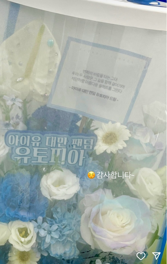 해당 선물은 아이유의 해외 팬덤 ‘유토피아’가 보낸 것으로, 포장지에는 “변화의 바람을 타는 그대, 우리 두 사람은 그 길을 함께 걸어가며 석양처럼 아름다운 팔레트를 그린다”는 시적인 메시지가 담겨 있었다.