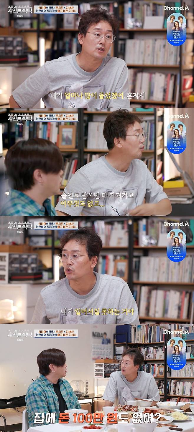 이어 김정태는 고시원에 있으면서 행복했다며 과거를 회상했다. 그러면서 "내가 잘 데도 없었다. 서울역 앞에 가면 노숙자 쉼터가 있었다. 연기할 때다. 내가 얼마나 많이 울었겠냐, 혼자서. 아무도 도와주는 사람이 없고 출연료 받으면 다 가져가고 아무것도 없고 돈 구경을 못하고 스쳐 지나갔다"라고 말했다.