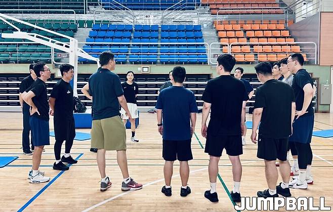40대 후반, 50대 심판들도 있다. 그래서 일정 조정을 잘 했다. 하루 두 번 훈련 중 오전에 영상 교육으로 하면서 전지훈련 프로그램 (강도를) 낮춰서 한 거다. 그냥 하는 게 아니다. 70%도 안 하는데 박신자컵이 한 달 남았으니까 80%로 올리고, 9월에는 연습경기를 다니면서 시즌 때까지 또 올리면 괜찮을 거 같다. 그럼 겨울에는 잘 버틸 거라고 본다.