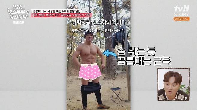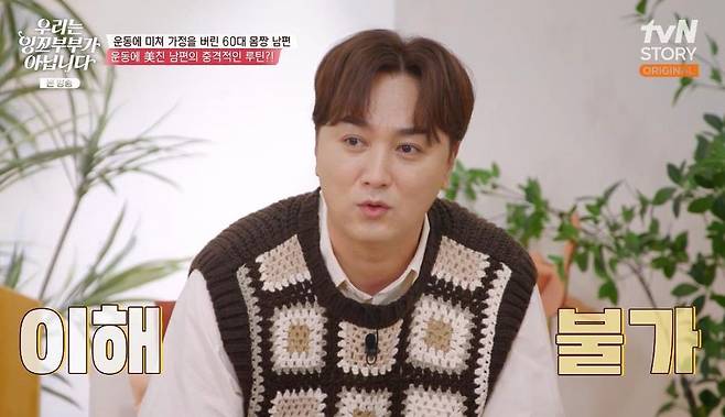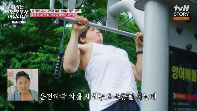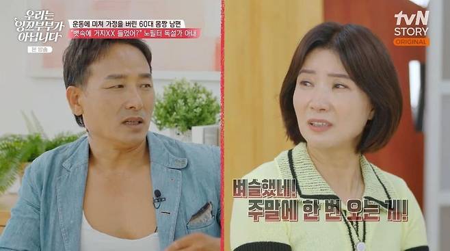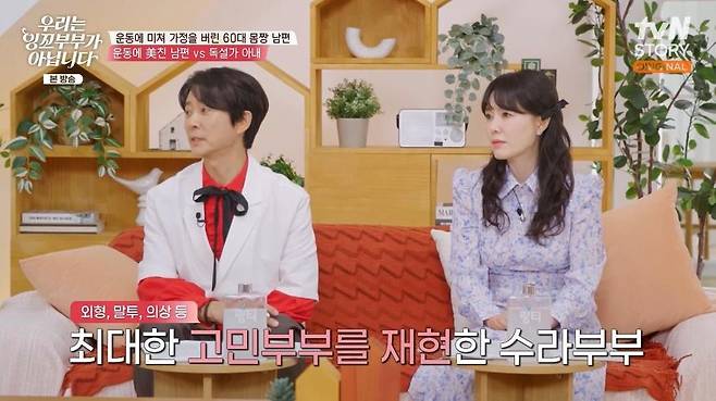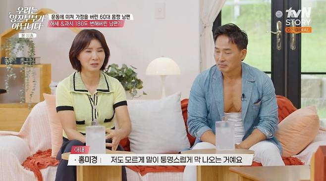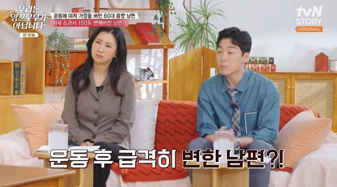 28일 방송된 tvN STORY 예능 프로그램 '우리는 잉꼬부부가 아닙니다' 5회에서는 중년계의 김종국을 꿈꾸는 60대 몸짱 남편과 그런 남편 때문에 차갑게 변해버린 아내가 등장했다.
