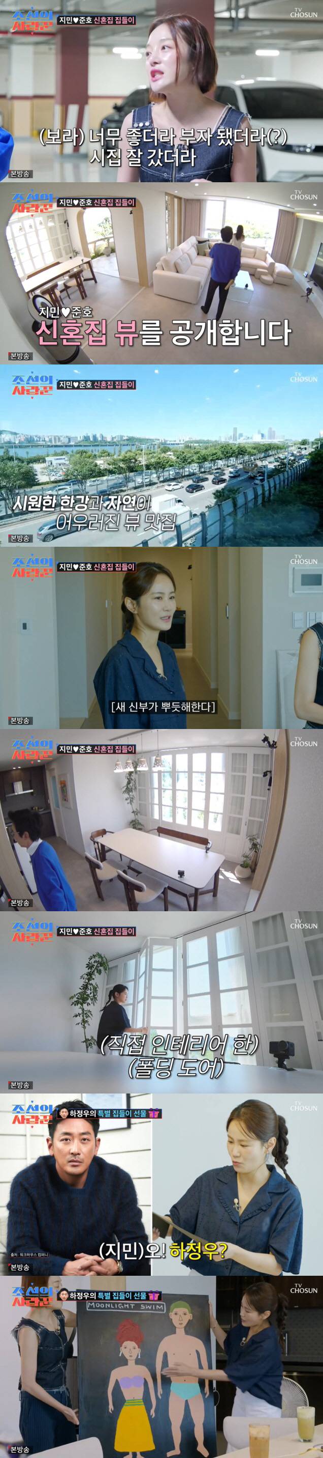 김지민의 신혼집에 도착한 사랑꾼 MC들은 한강이 보이는 탁 트인 뷰에 감탄했다. 다이닝룸 채광도 남달랐고, 김지민은 직접 인테리어 한 폴딩 도어를 자랑해 눈길을 끌었다. 이에 황보라는 "성공한 냄새가 난다. 시집 잘 갔다, 지민이!"라며 칭찬했다.
