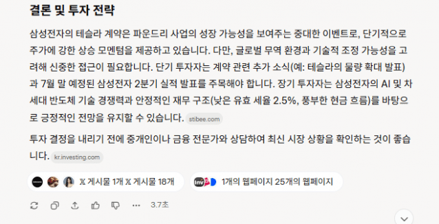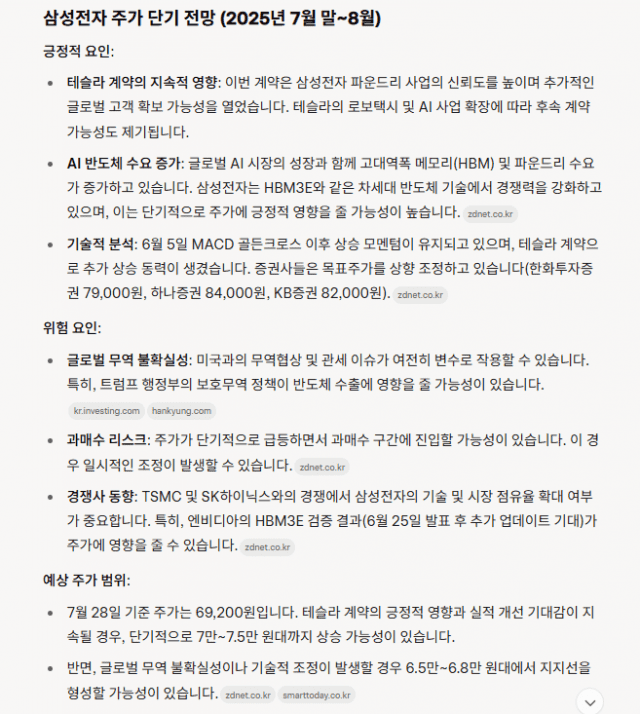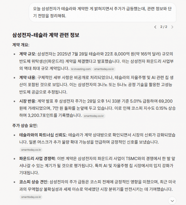질문: 오늘 삼성전자가 테슬라와 계약한 게 밝혀지면서 주가가 급등했는데, 관련 정보와 단기 전망을 정리해줘.