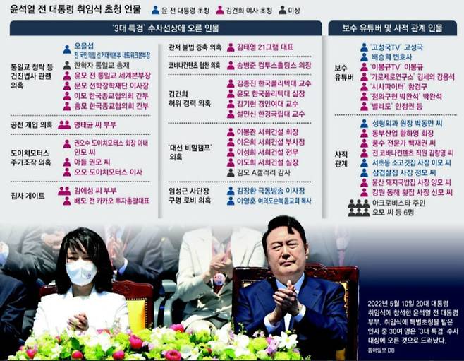 윤석열 전 대통령 부부 관련 수사를 진행하는 3개 특검의 수사 대상 가운데 적어도 30여 명이 2022년 5월 대통령 취임식에 초청됐던 인물인 것으로 나타났다.