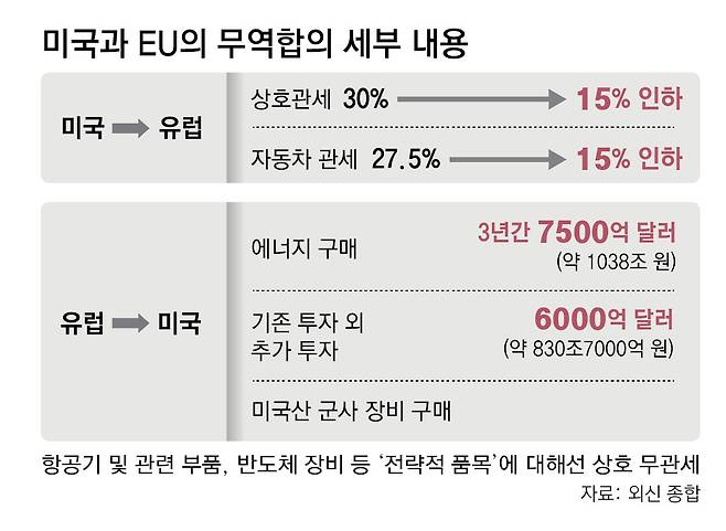 트럼프 대통령이 이날 우르줄라 폰데어라이엔 EU 집행위원장과의 회담 뒤 들고나온 문서에는 EU의 대(對)미국 투자 금액이 5000억 달러에서 6000억 달러로 수정돼 있었다. 앞서 22일 일본과의 합의 당시 4000억 달러로 표시된 문서를 5500억 달러로 늘린 것과 유사하다. 또 EU의 미국산 에너지 구매 비용도 6000억 달러에서 7500억 달러로 수정돼 있었다. EU는 향후 막대한 규모의 미국산 군사 장비도 구매할 예정이다.