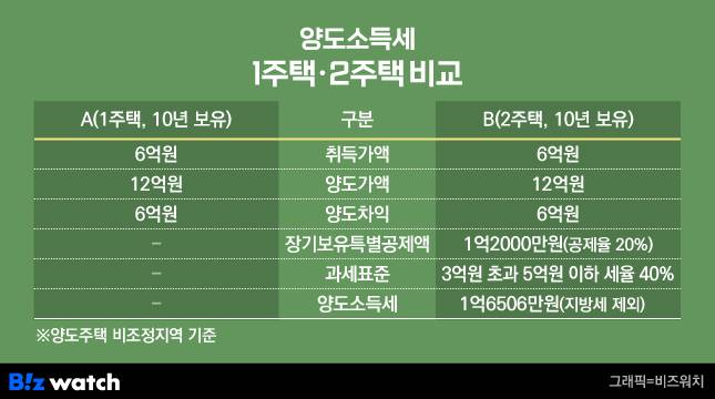 다른 주택 1가구를 더 가진 B씨라면 다르다. A씨와 같은 시기 6억원에 산 동일한 아파트를 마찬가지로 12억원에 팔았다면 6억원의 차익에 대한 세금을 내야 한다. 양도 주택을 10년 이상 보유해 장기보유특별공제 제도로 20%의 공제율을 적용받고 4억8000만원(기본 공제액 250만원 제외)이 과세 표준이 된다. 이에 따라 B씨가 내야 할 양도세는 지방세를 빼고도 1억6506만원이다.