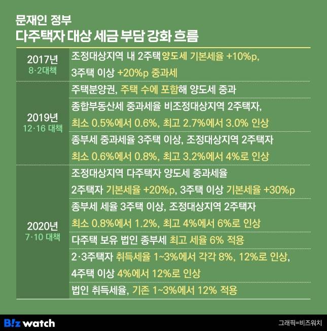 문재인 정부는 2020년 7월10일에 다시 다주택자를 대상으로 부동산 세금을 중과한다. 조정대상 지역 내 2주택자와 3주택자의 양도세 중과세율을 기본세율에 20%포인트, 30%포인트를 더하기로 했다.