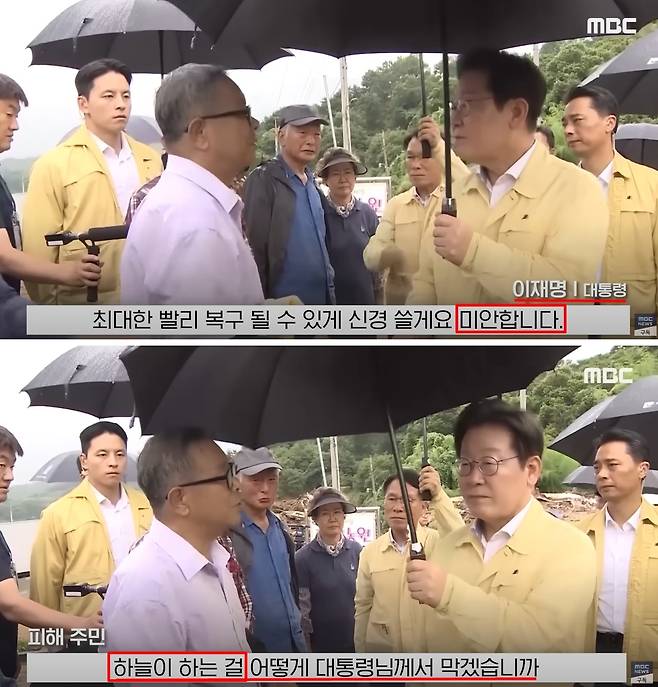 | ▲ 산사태 피해가 큰 산청 부리마을을 찾은 이재명 대통령이 피해 주민들께 미안하다고 사과했다. |