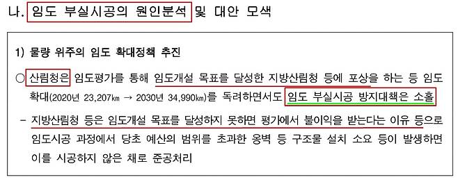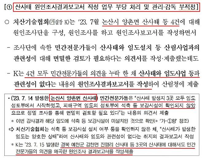 | ▲ 산사태 원인이 산림청의 임도 때문이라는 지적에도, 민간전문가들의 의견을 왜곡해서 조사 보고서를 작성했다고 감사원이 감사 결과를 발표했다. |