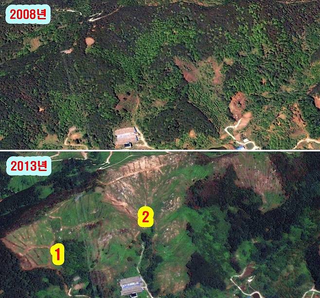 | ▲ 산불 피해지를 복구한다며 벌목하고 조림한 자리와 산사태 발생한 위치가 일치한다. |