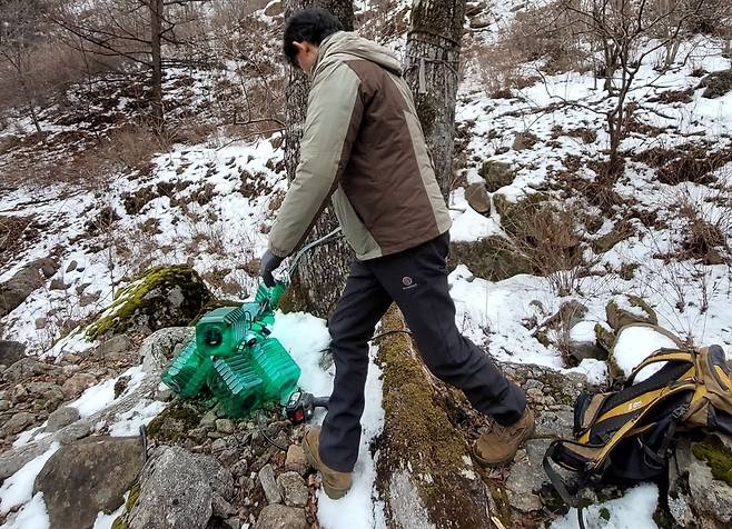 | ▲ 눈 쌓인 1월 말 지리산 산청 인근에서 고로쇠 수액을 채취하는 모습이다. |