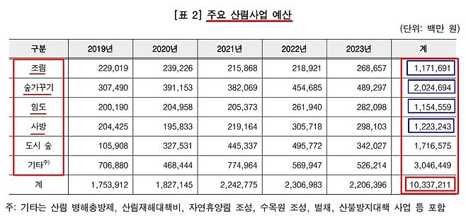 | ▲ 감사원 감사결과 발표 자료에 기록된 산림사업 예산들 |