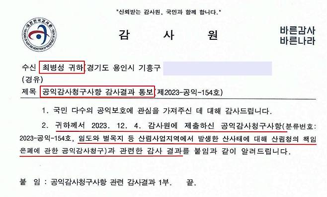 | ▲ 감사원에 산림청 범죄에 대한 공익감사를 청구했다. 1년 5개월만에 감사 결과가 나왔다. |