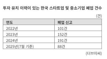 폐업 기업 중에는 일정 수준 이상의 성과를 인정받았던 팁스(TIPS) 선정 기업도 다수 포함됐다. 올해 상반기 폐업을 신고한 팁스 출신 기업은 23개로, 전체의 26.1%에 달했다. 이는 2022년 16%(16개), 2023년 17%(21개), 2024년 20%(38개)에 비해 뚜렷한 증가세다.