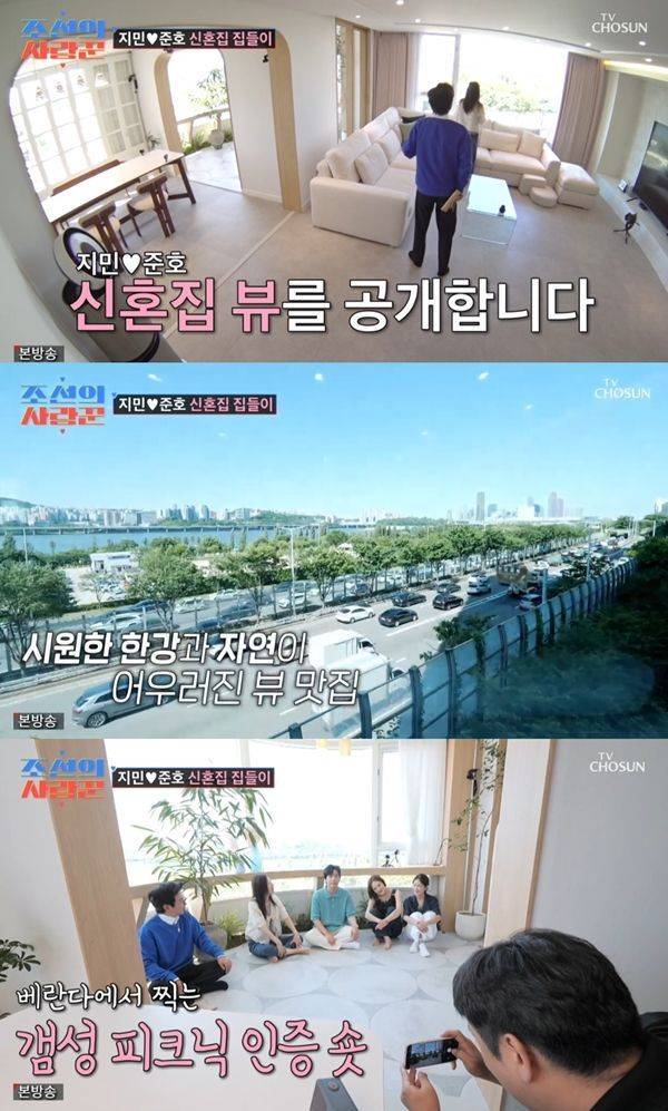 이날 김지민은 신혼집으로 출연진을 초대했다. 집들이 선물을 들고 들어선 이들은 "뷰 너무 좋다"면서 거실 창으로 보이는 한강뷰에 감탄했다. 한강과 자연이 어우러져 황보라는 "성공한 냄새가 난다"라며 너스레 떨었다.