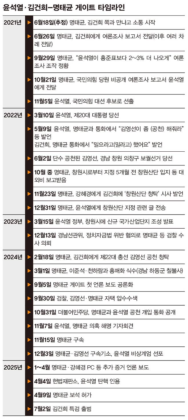 이렇게 명태균 게이트는 공천, 여론조작, 국정 개입, 예산 로비 등이 총망라돼 있다. 제기된 사건과 자료가 방대한 만큼, 아직 드러나지 않은 내용도 상당하다는 분석이 나온다. 게이트의 중심인 윤석열 부부와 명태균씨는 곧 김건희 특검의 포토라인에 설 예정이다. 명태균·김건희·윤석열이 꾸려온 세계의 처음과 끝은 어디까지 밝혀질 수 있을까.