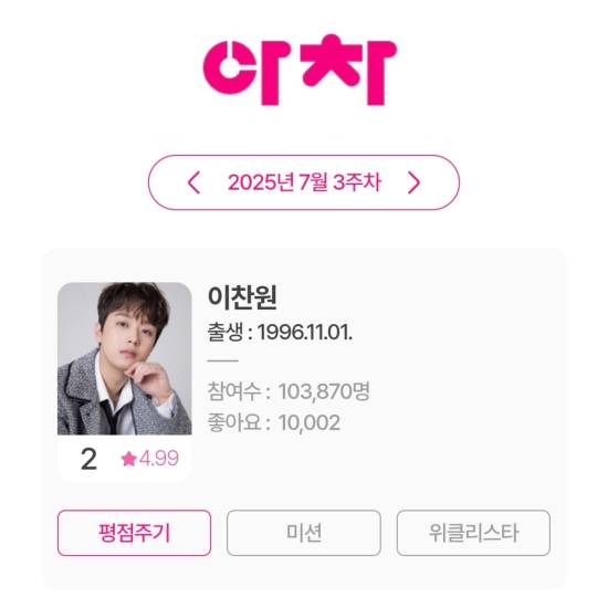 이찬원이 아이돌차트 평점랭킹에서 180주 연속 2위를 기록했다.