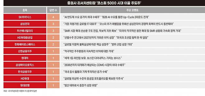 애널리스트 10명 중 4명이 꼽은 주도주 1위는 SK하이닉스다. 올 들어 주가가 57% 상승했지만, 여전히 실적을 떠받칠 고대역폭메모리(HBM) 수요가 탄탄하기 때문이다.